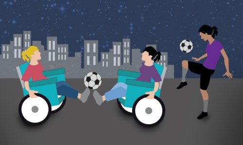 For sufferers of Cerebral Palsy, the game can be played both seated and standing. Seated, players will often play in wheelchair or powerchair football teams and leagues (see below). The standing game is usually played with seven-a-side teams, on a smaller pitch with slightly smaller goals. With two thirty-minute halves and no off-side rule, the only other difference from non-disabled football is that players can roll or throw the ball back into play.